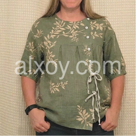 This loose-fit top features a soft olive green base with delicate leaf patterns. Front button-down design and side ties add a stylish touch. Short sleeves with rolled cuffs for comfort. Lightweight fabric perfect for casual wear. Effortlessly chic with a boho-vibe.
