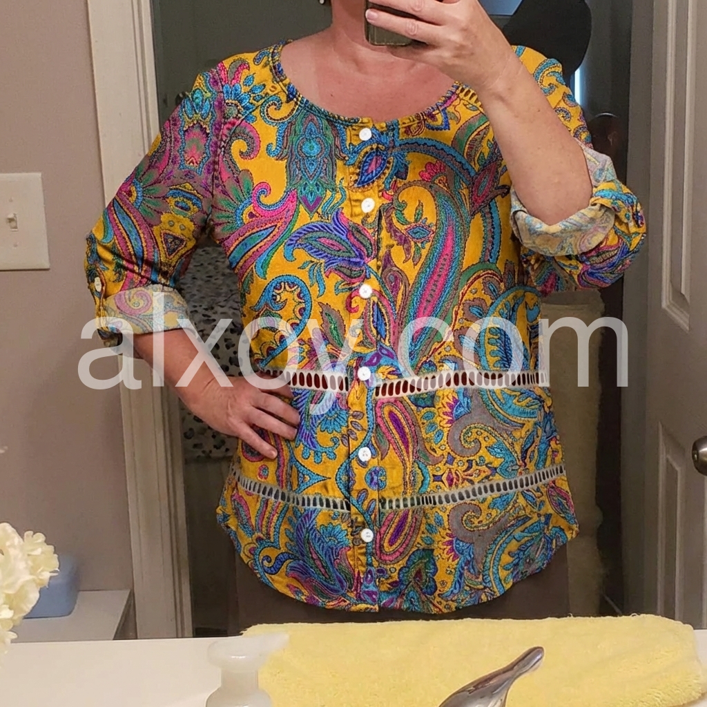 This long-sleeve tunic features a rich yellow base with colorful paisley patterns. The front button design adds vintage charm. Relaxed fit and rolled sleeves for comfort. Perfect for casual wear or bohemian styles. Pair with jeans or leggings for effortless flair.
