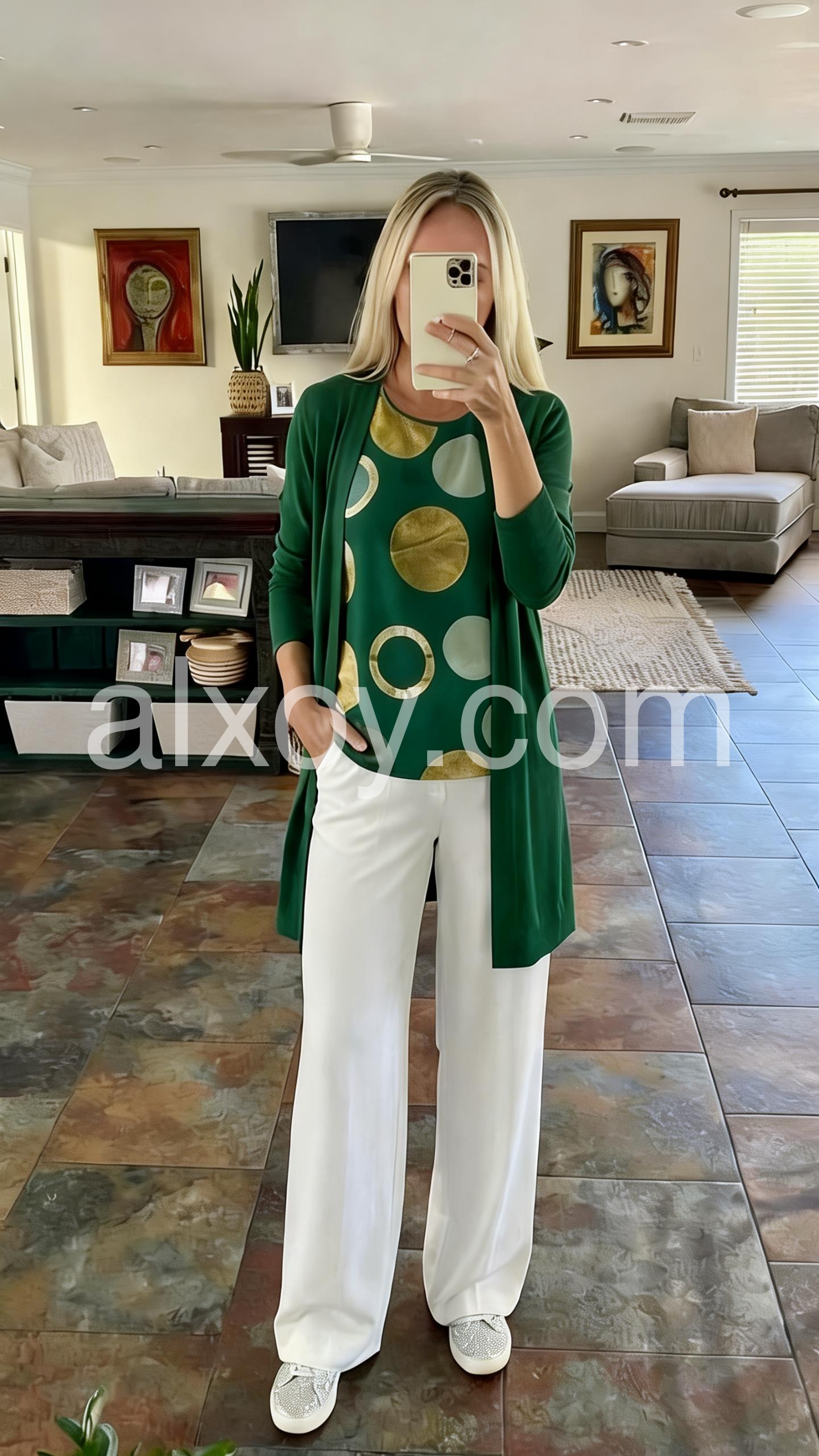 This three-piece look features a green top with gold and white circle print, paired with crisp white wide-leg pants. A matching long cardigan adds elegance and layering. Perfect for spring or summer days. Effortlessly chic and comfortable for any occasion.