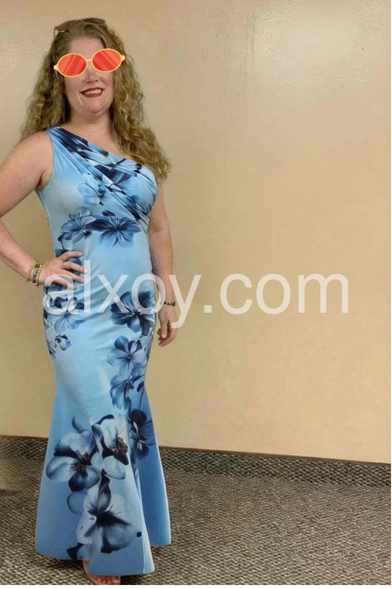 I felt so glamorous in this! The gradient blue tones and the large flowers are just striking. It is form-fitting in the best way possible. Perfect for a tropical getaway or resort evening.