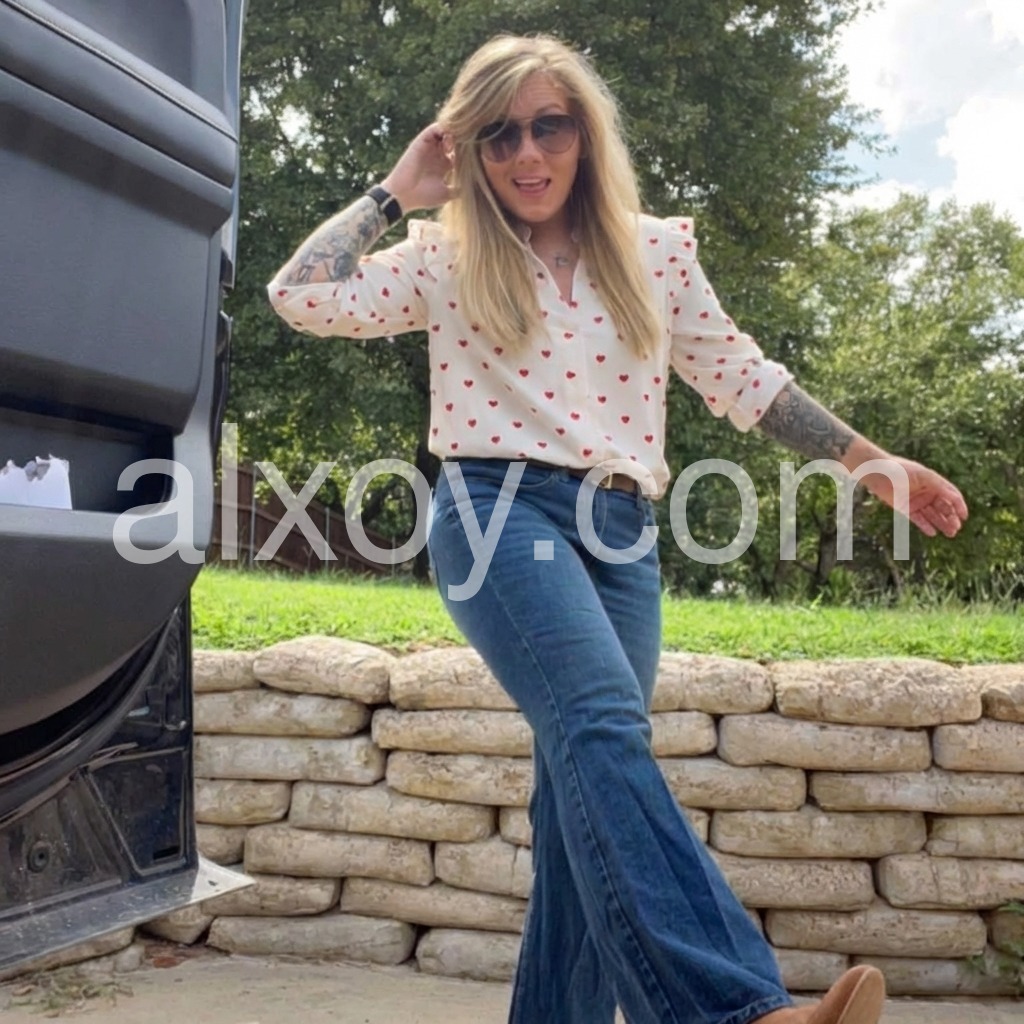 Take this lightweight red heart blouse anywhere with its fitted leg o’ mutton long sleeves with flared ruffles on the shoulders. The plunging fold-over v-neckline and fitted silhouette can be paired with high-waisted denim, slacks, or shorts. Finish your look with casual sneakers, sandals, and so much more. Wash in gentle or delicate cycle with light colors. Keep away from dark colors. The delicate fabric may absorb dark colors.