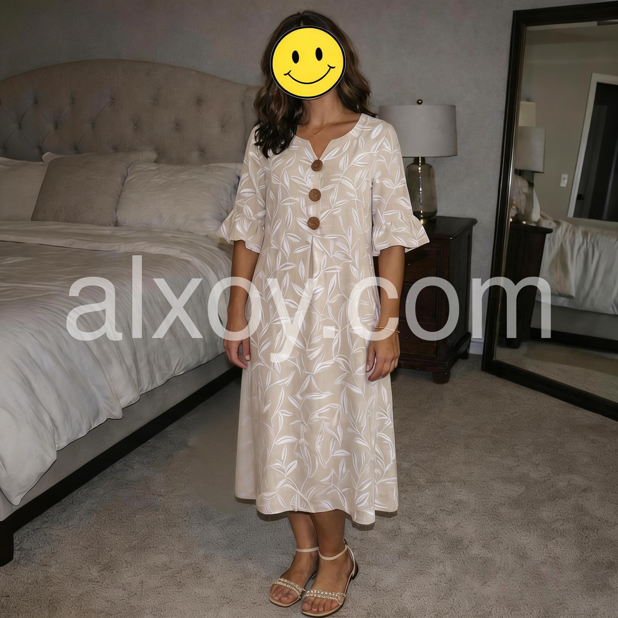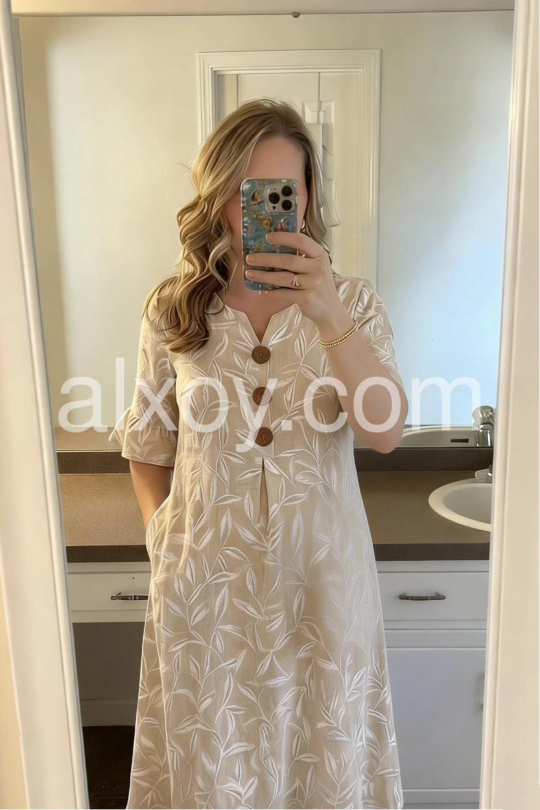This flowy midi dress features a soft beige base with white leaf patterns. V-neckline with wooden buttons and flared sleeves for a relaxed look. Lightweight fabric perfect for warm weather. Ideal for beach outings or casual days. Effortlessly stylish and comfortable.