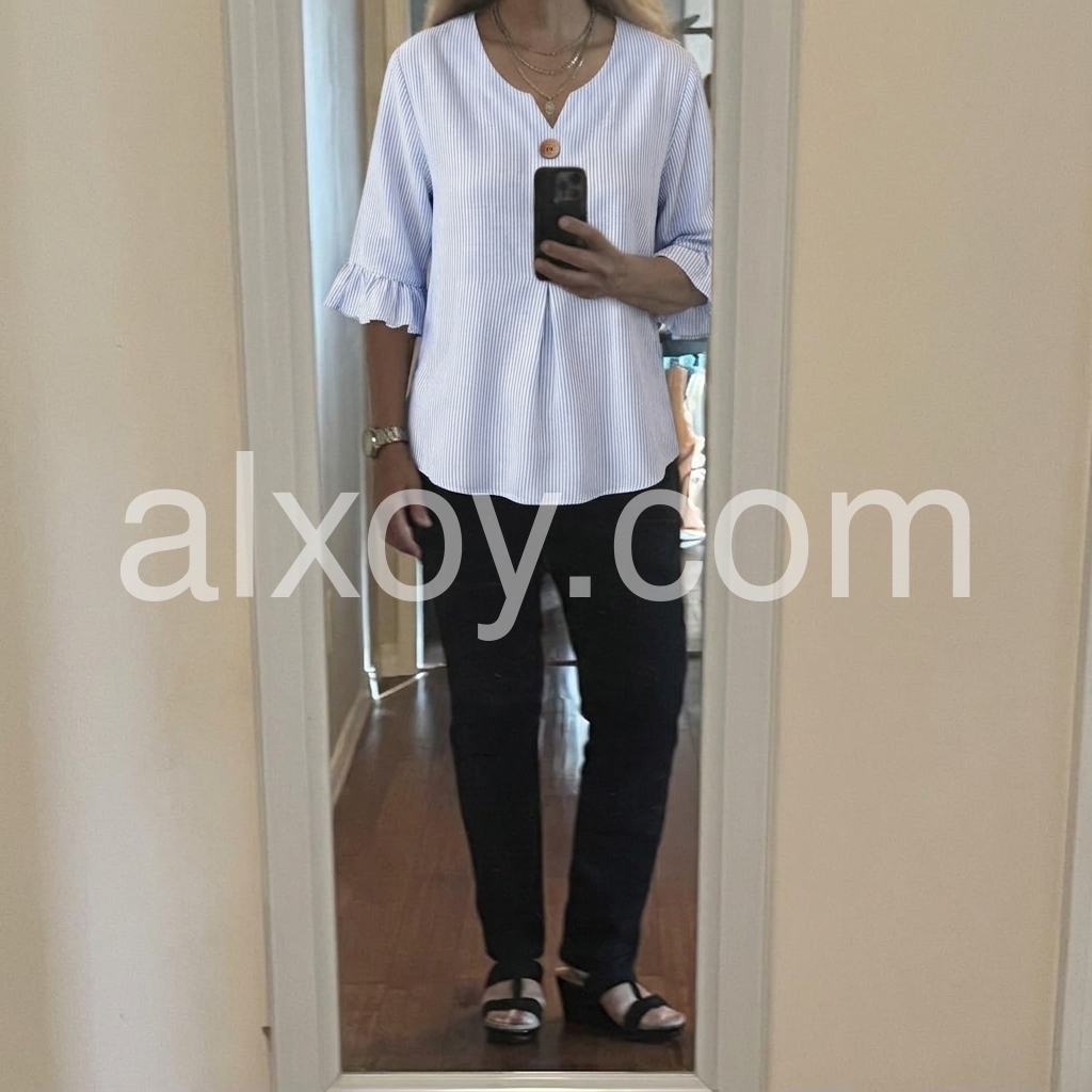 As a designer, I crafted this blouse to solve the common pain point of "too casual or too formal" daily tops. The notched V-neck flatters all necklines, while the ruffled cuffs add a feminine touch without being overly frilly.
