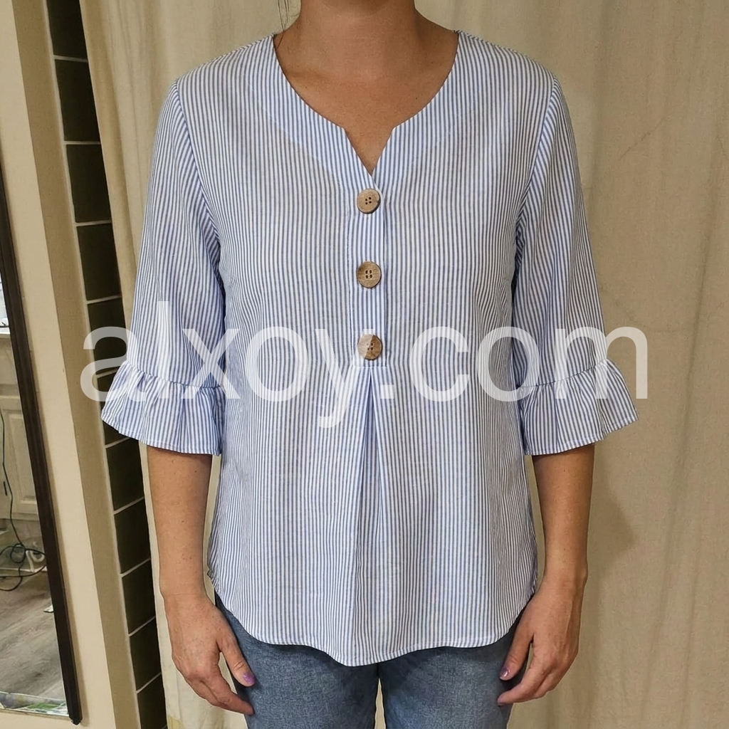 Blue Stripe Ruffle Sleeve V-Neck Blouse