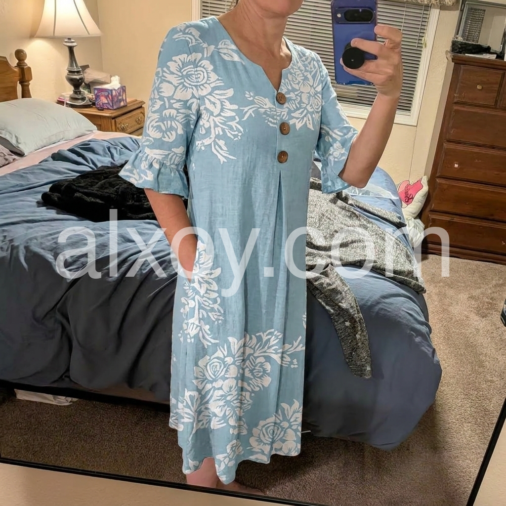 Blue Floral Ruffle Sleeve Button Linen Maxi Dress