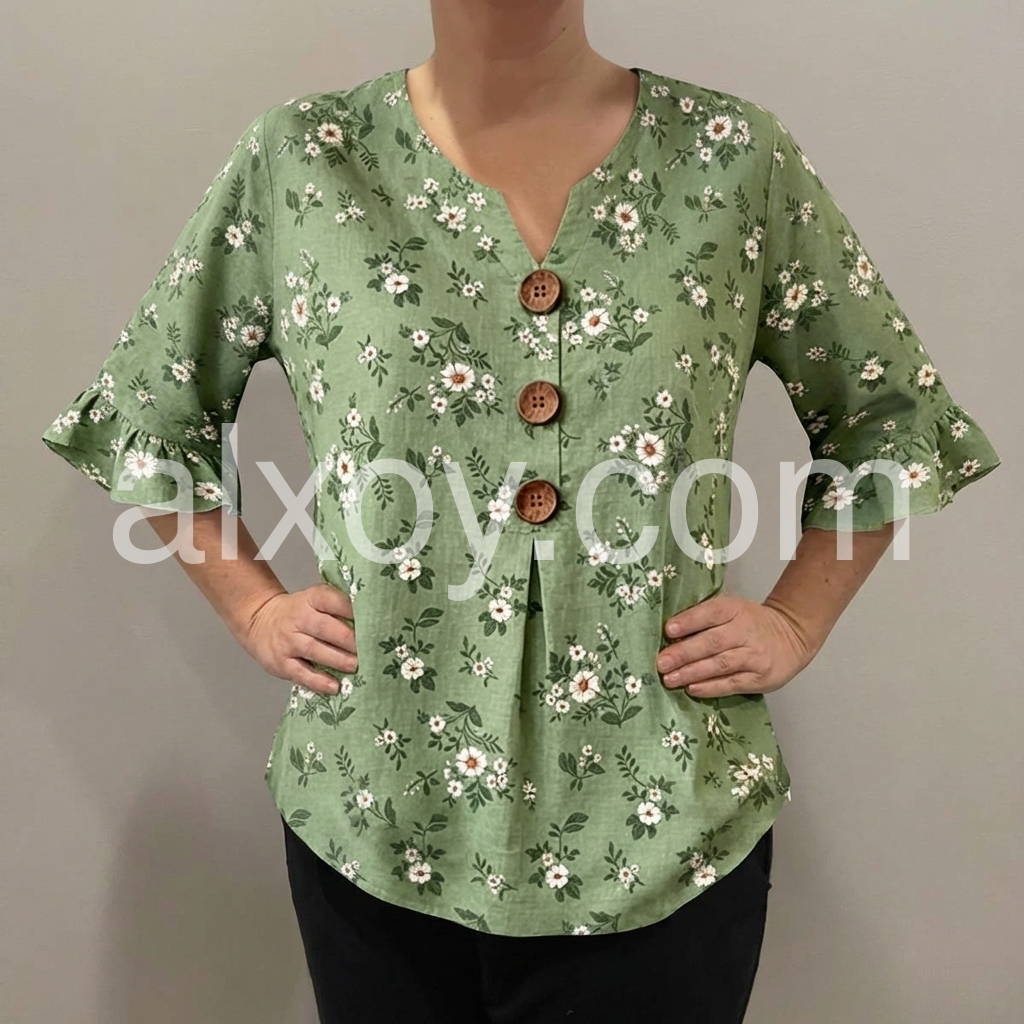 This blouse was created to bring soft, feminine charm to your everyday wardrobe. The delicate floral print on muted green feels fresh and timeless, never going out of style.