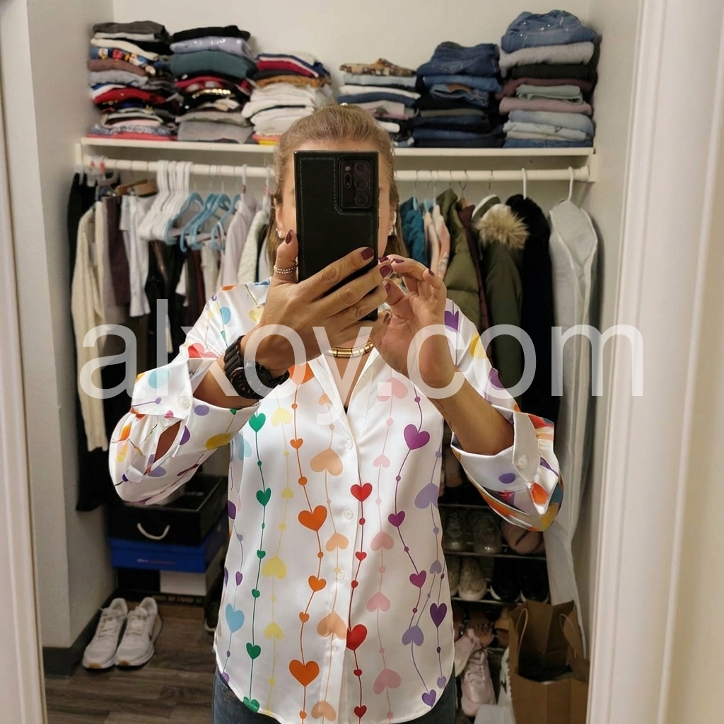 Elevate your wardrobe with this sophisticated satin blouse, featuring an enchanting heart print that adds a touch of romance to any ensemble. Crafted from luxurious satin fabric, this long-sleeve piece drapes beautifully while maintaining a polished silhouette. The smooth, lustrous finish catches light gracefully, making it ideal for both professional settings and evening occasions. Versatile enough to pair with tailored trousers or flowing skirts, this blouse seamlessly transitions from day to night. Perfect for those seeking refined elegance with a subtle hint of charm.