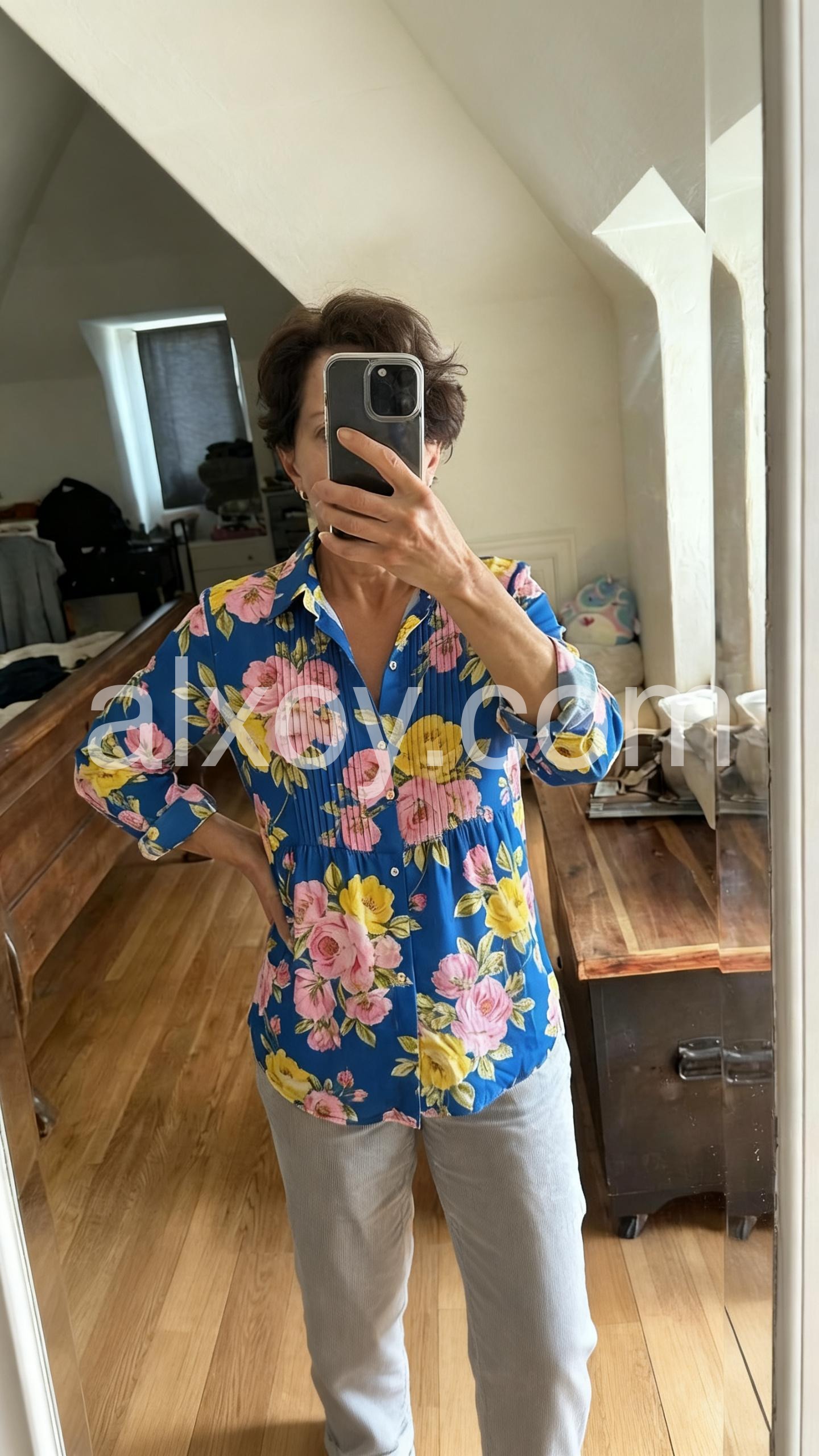 This has quickly become my go-to blouse. The blue really pops, and the yellow and pink roses are stunning. It washes well and does not wrinkle easily.