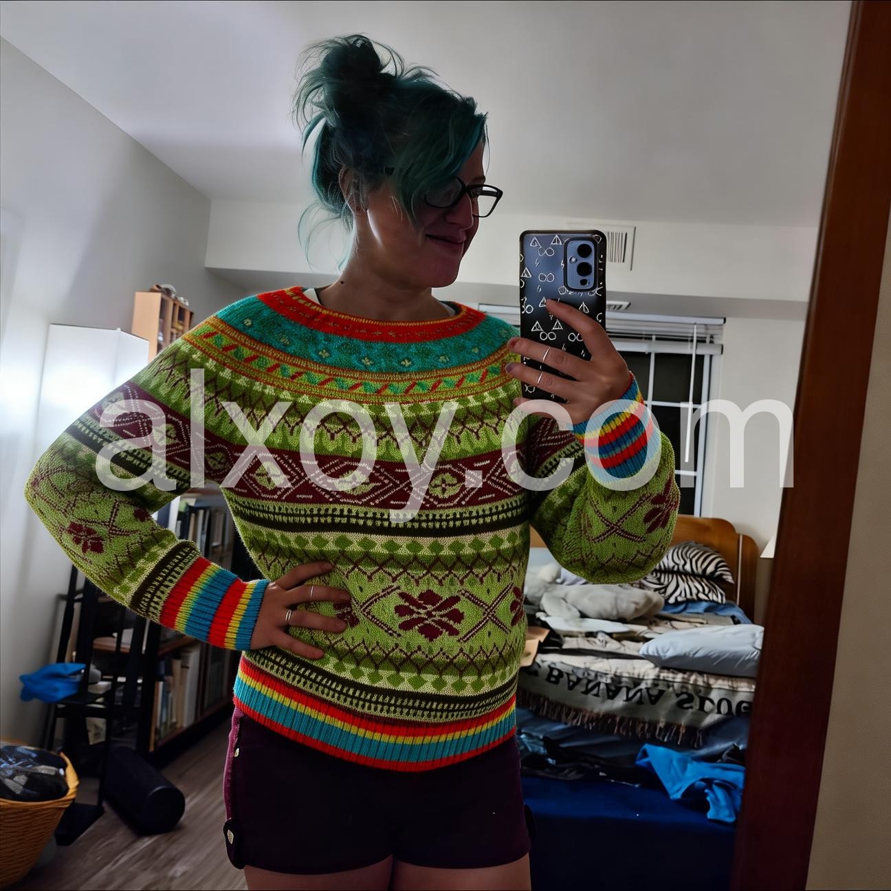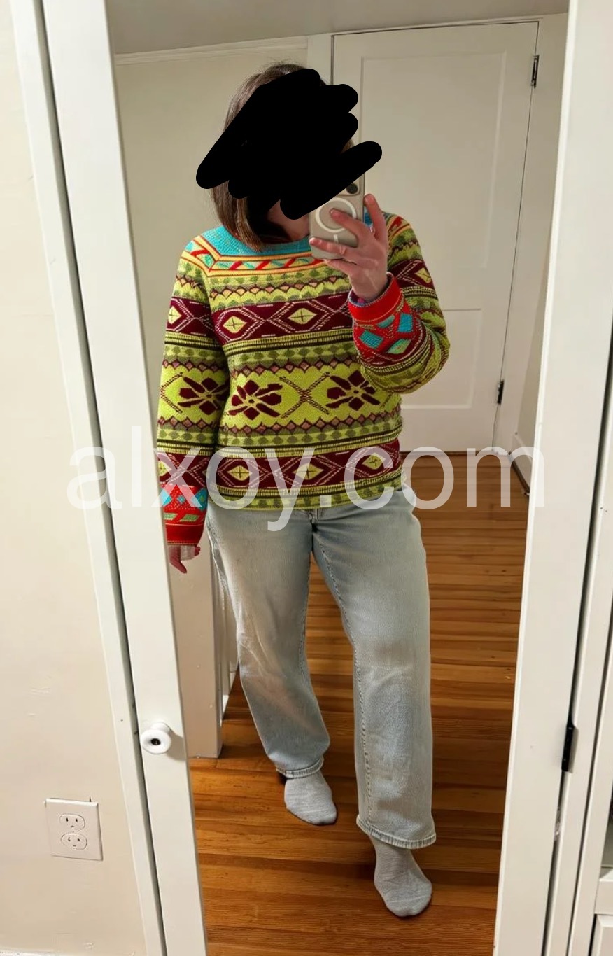 Steal the spotlight in this unique sweater knit in bright shades and a bold stripy pattern. The cozy style has a relaxed fit and pulls on with a wide neckline that shows off your collarbone. Style it with faded straight-leg jeans and combat boots for a 90s-vibe look.