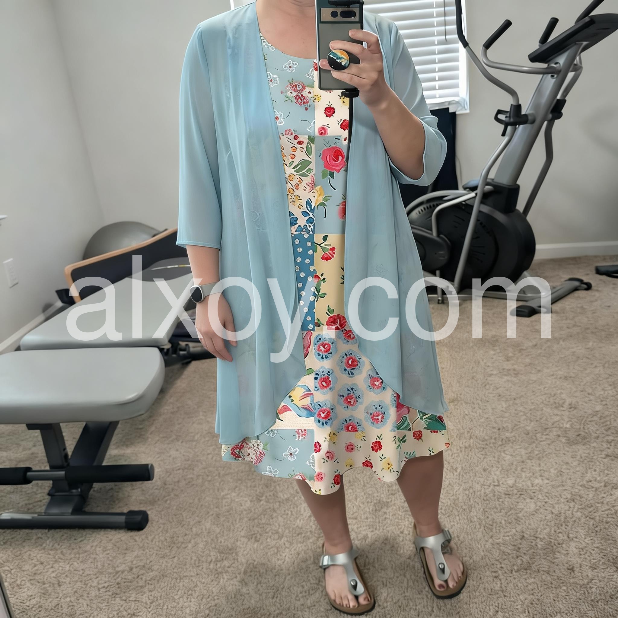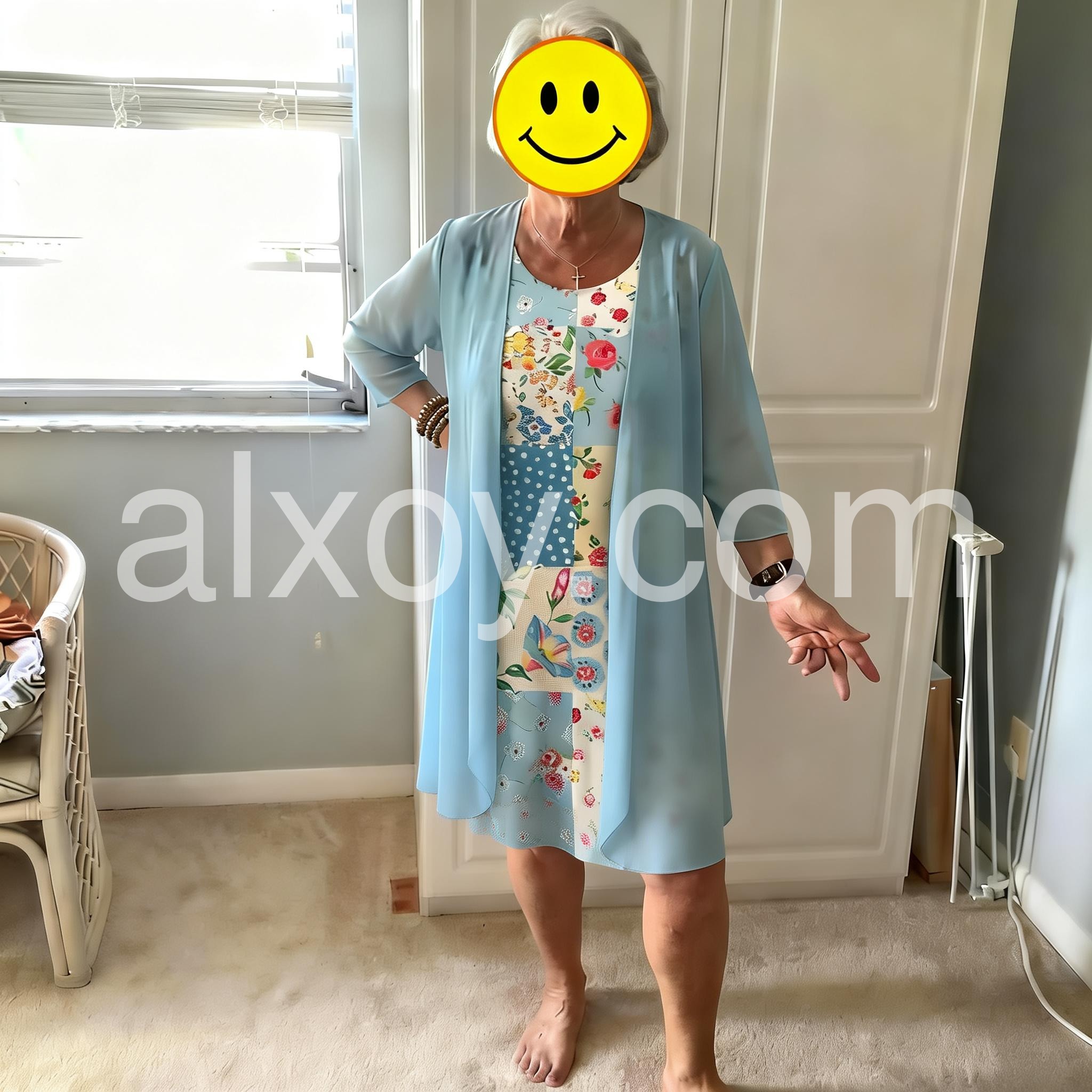 This colorful dress features a patchwork design with floral and polka dot patterns. Paired with a flowing light blue jacket for a layered look. Lightweight and perfect for spring or summer days. Ideal for casual outings or garden events. Stylish and full of charm.