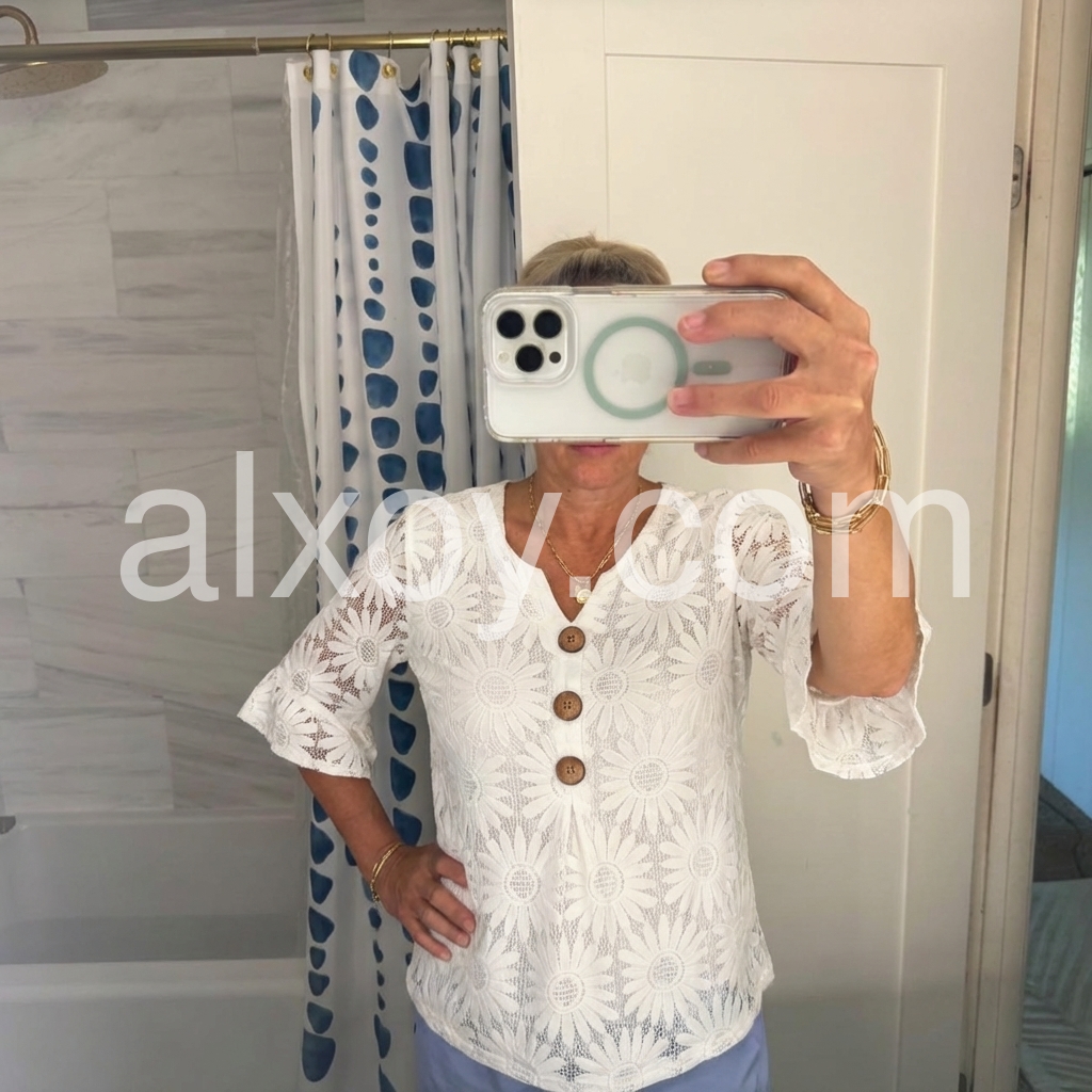 This blouse reimagines timeless femininity with intricate daisy-patterned lace. The crisp white openwork fabric creates a delicate, luminous silhouette, perfect for elevating everyday looks.