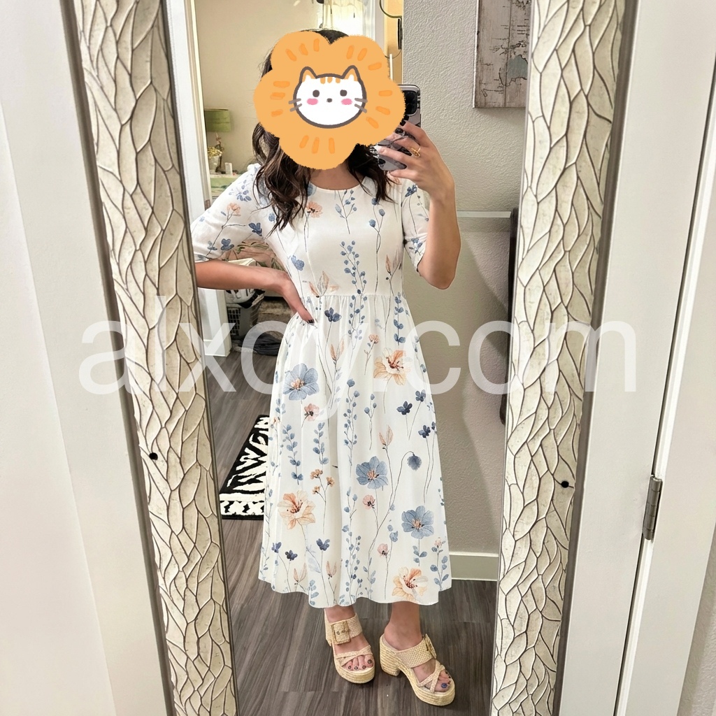 The round neck and elbow-length sleeves offer gentle coverage, while the flowy A-line skirt skims over hips and thighs. The lightweight fabric is breathable and comfortable, perfect for warm weather.