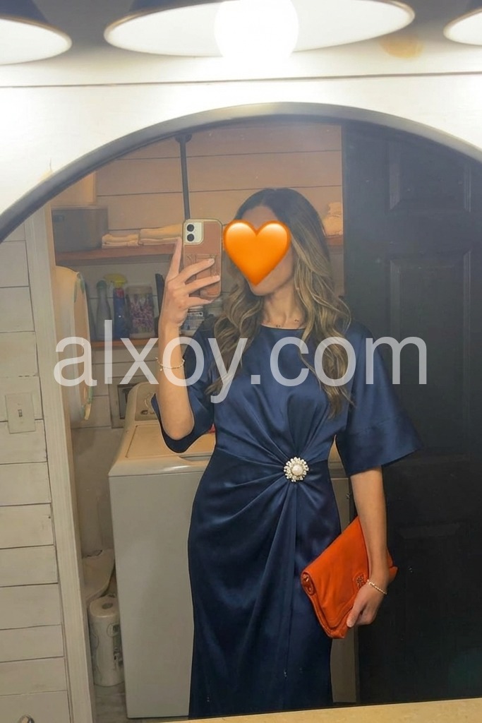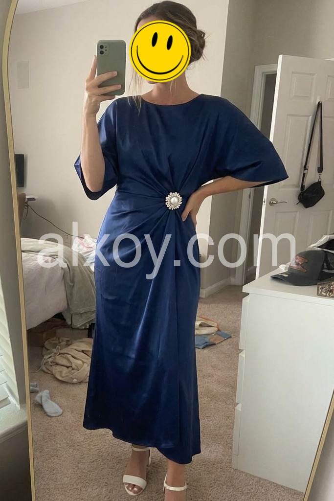 Elevate your wardrobe with this sophisticated navy satin midi dress, designed for the discerning woman who values timeless elegance. The flowing cape sleeves add a dramatic yet refined silhouette, while the luxurious satin fabric drapes beautifully against the body. Perfect for evening events, formal occasions, or elevated everyday wear, this versatile piece transitions seamlessly from day to night. The midi length offers a modern take on classic sophistication, providing both coverage and movement. A wardrobe essential that combines understated luxury with contemporary design.