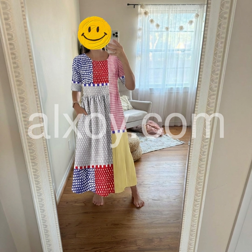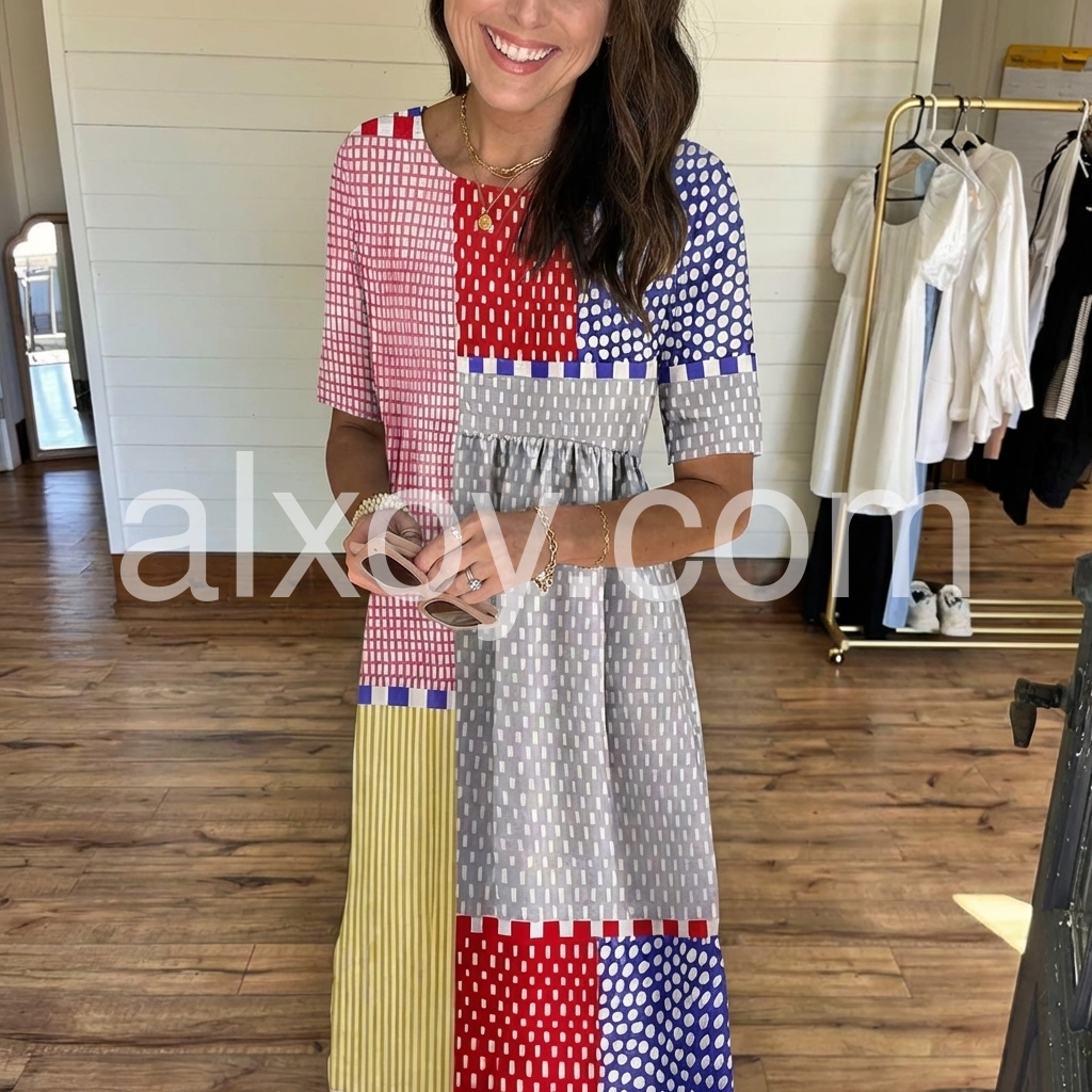 The bold, multicolored geometric patchwork print makes a striking statement, while the gathered waist and pockets add comfort and function.