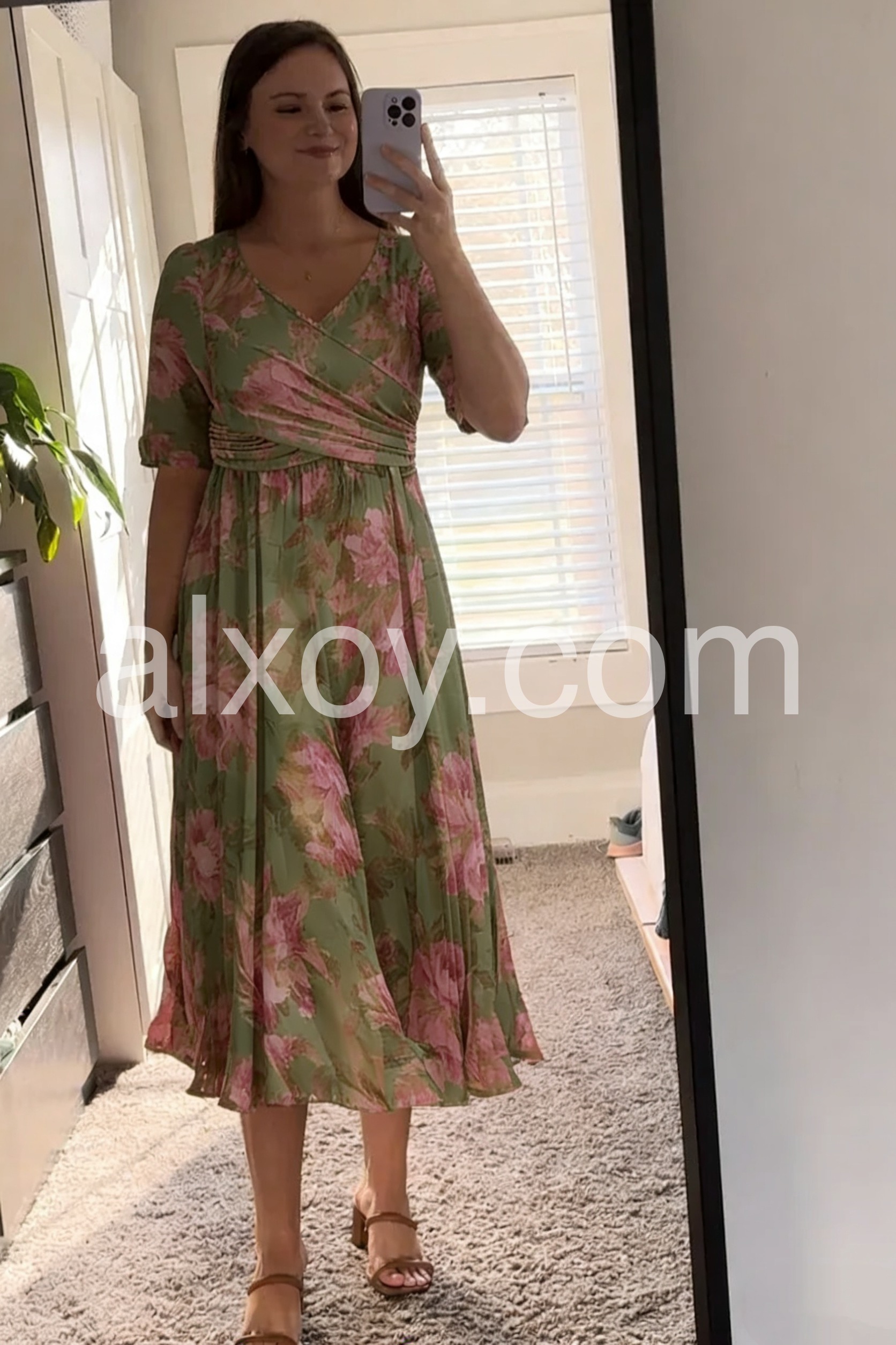 This wrap-style midi dress features a lush green base with soft pink rose prints. The V-neck and short sleeves create a graceful silhouette. Side pockets add comfort and convenience. Lightweight fabric perfect for warm days. Ideal for garden parties or casual outings.