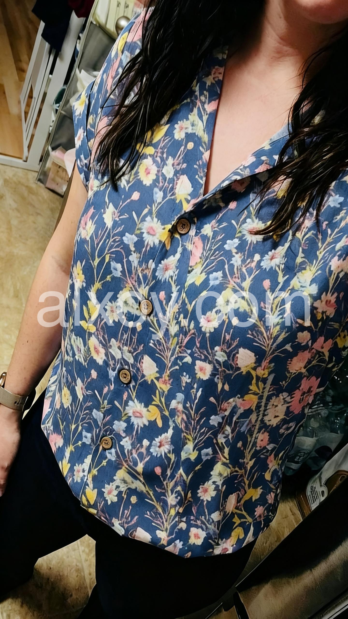 This short-sleeve V-neck blouse features a delicate floral print on a deep navy background. The button-down front adds a polished touch. Lightweight fabric perfect for warm weather. Pair with jeans or skirts for effortless style. Ideal for casual outings or spring days.