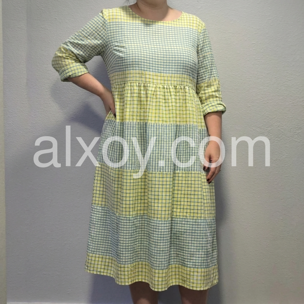 This midi dress celebrates effortless summer style with a playful color-block gingham design. The round neck, 3/4 sleeves, and tiered skirt offer a relaxed, flowy fit.