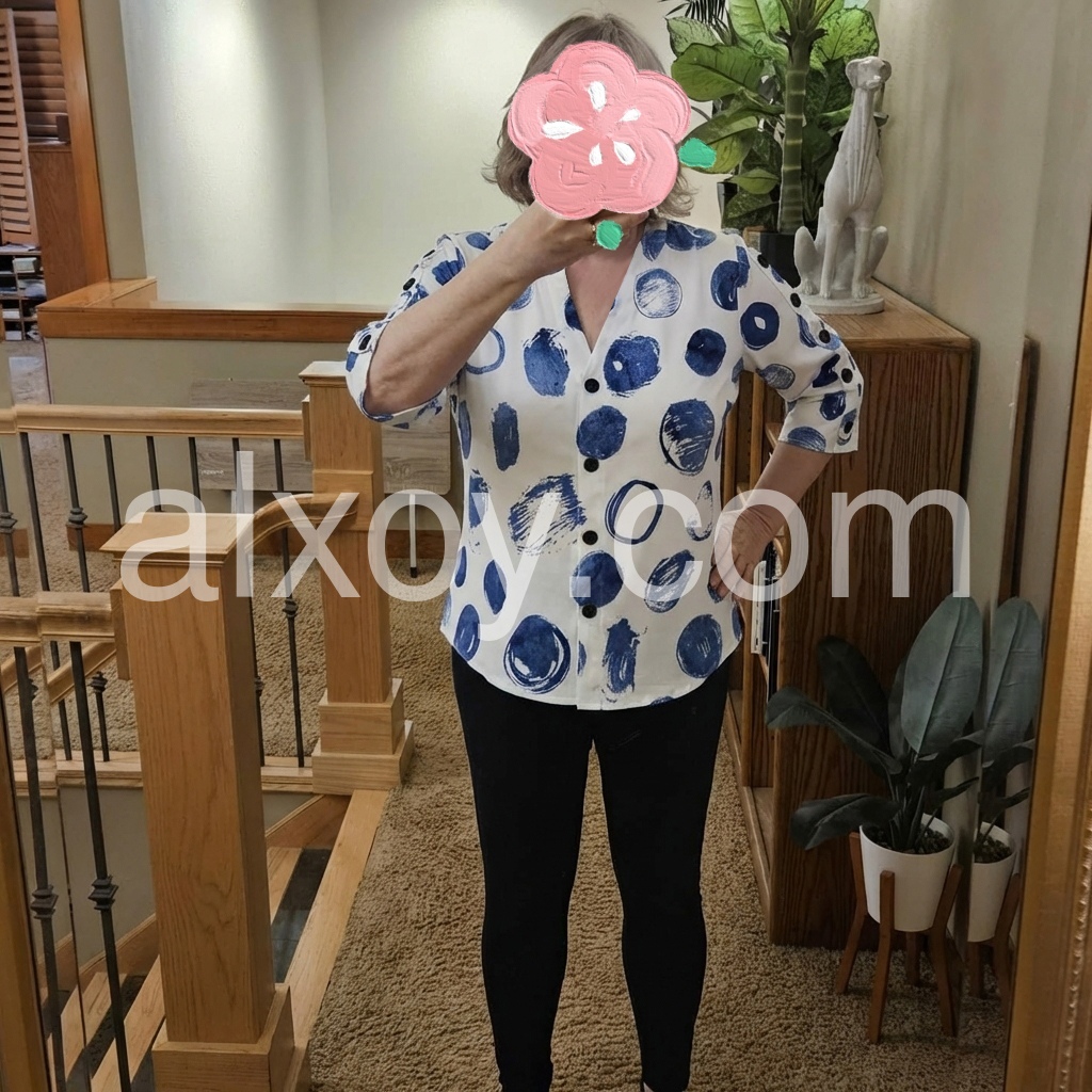 This V-neck blouse features a bold blue abstract dot print on a white background. Button-down front with three-quarter sleeves and button cuffs. Relaxed fit perfect for casual wear. Ideal for pairing with jeans or shorts. Modern and eye-catching design.