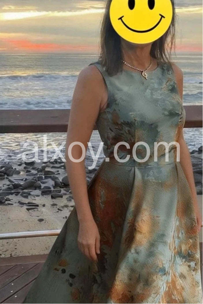This stunning sleeveless midi dress features a bold abstract print with a harmonious blend of soft blue, earthy rust, and muted gold tones, reminiscent of a watercolor masterpiece. Crafted from luxurious, structured fabric, the dress boasts a flattering high-neck design and a tailored fit through the bodice that elegantly flares into an A-line skirt, creating a graceful silhouette. The mid-calf length adds timeless sophistication, making it perfect for cocktail parties, weddings, or upscale evening events. Paired with delicate heels and a sleek clutch, this dress exudes refined elegance and artistic flair—ideal for those who appreciate fashion with a touch of modern artistry.