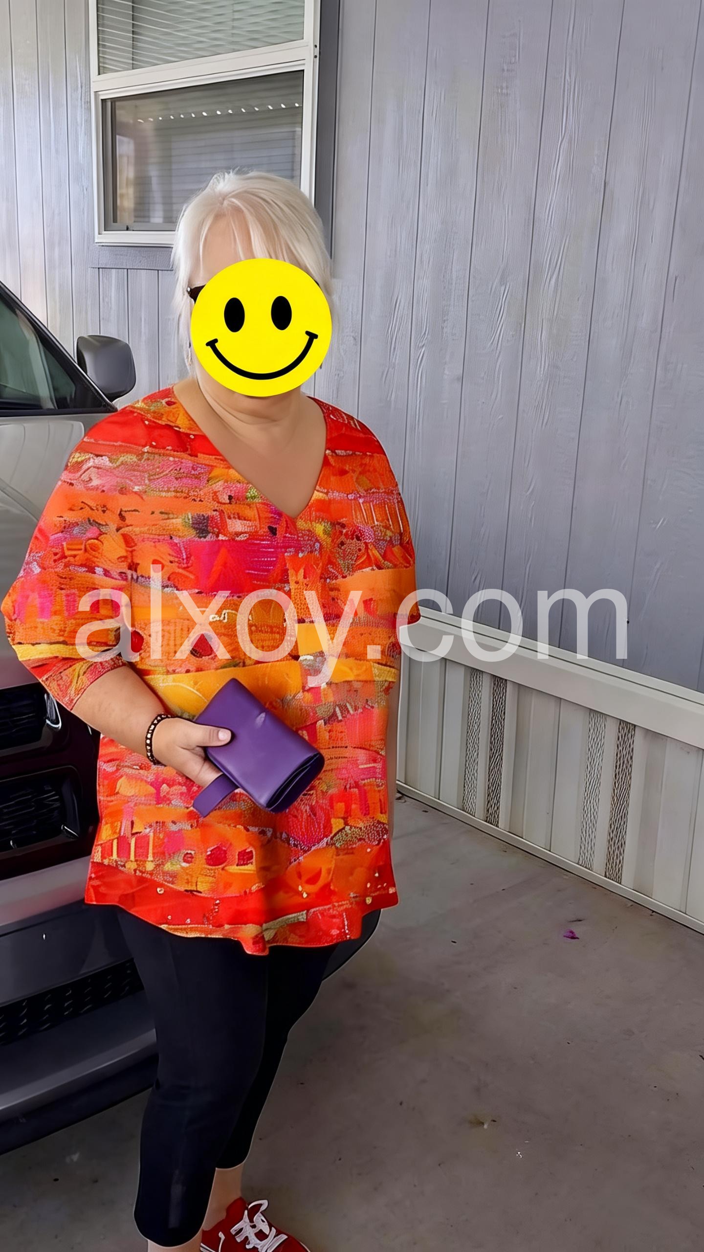 This loose-fit top features a striking abstract pattern in warm red, orange, and pink tones. V-neckline and three-quarter sleeves for comfort. Lightweight fabric with a relaxed drape. Perfect for making a statement in casual or resort wear. Effortlessly stylish and eye-catching.