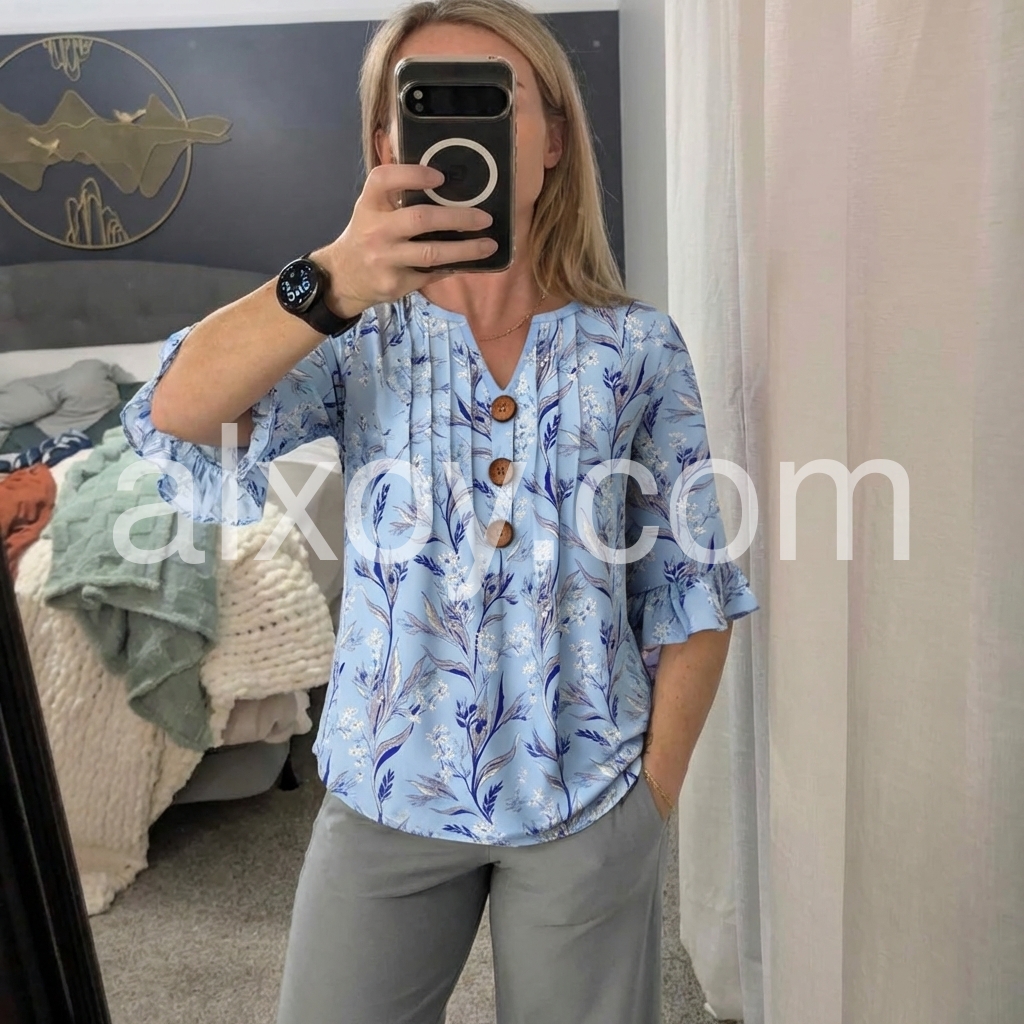The V-neck, pleated front, and ruffle cuffs add refined detail, while the relaxed fit offers all-day comfort.
