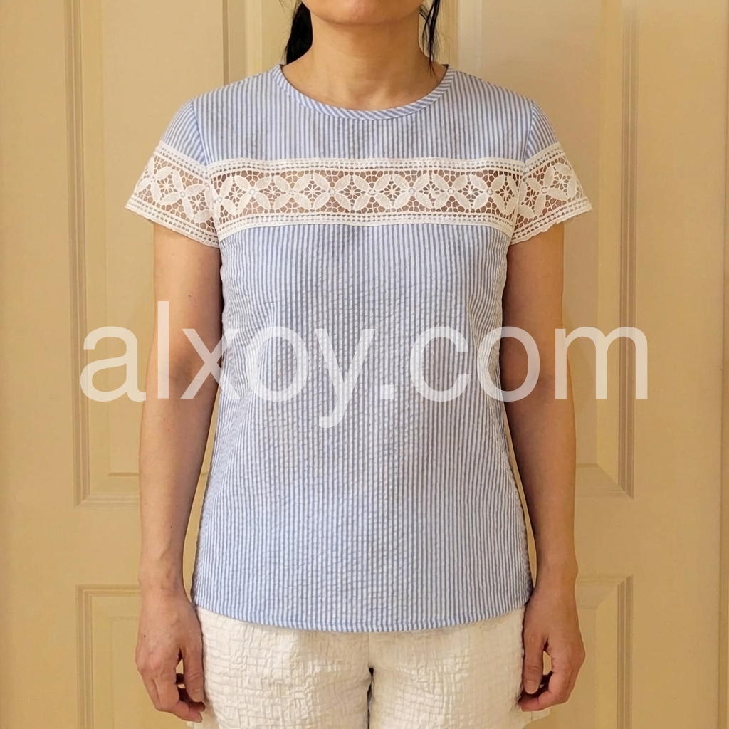 This short-sleeve top features a delicate white lace panel across the chest and sleeves. Made from soft, textured fabric with vertical stripes for a subtle pattern. Perfect for casual summer days or beach outings. Pair with shorts or jeans for a stylish look. Effortlessly chic and breathable.