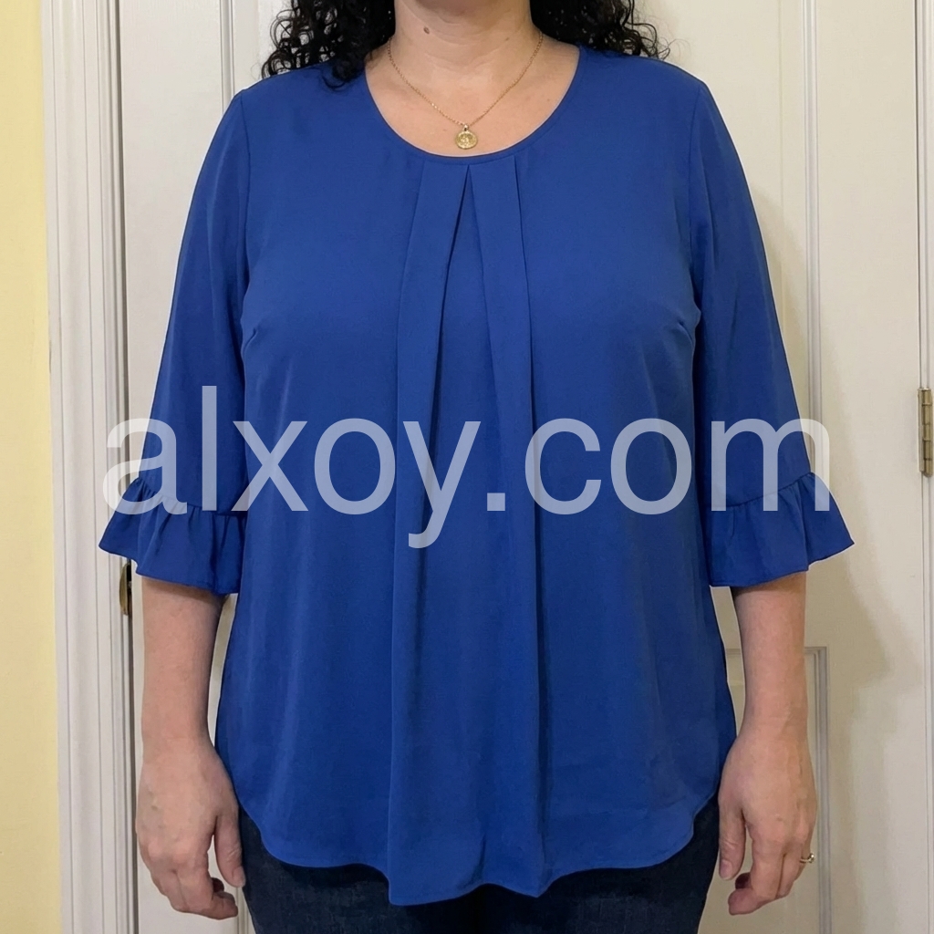 Elevate your everyday style with this gorgeous royal blue blouse. It features delicate front pleats and flirty ruffled cuffs, adding a touch of elegance to your look.