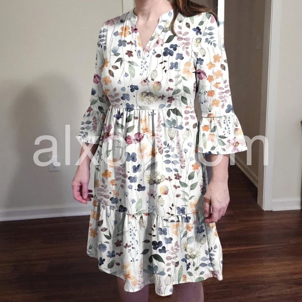 This white floral dress features a V-neck, button-down front, and flared bell sleeves. The tiered skirt adds movement and charm. Soft pastel blooms create a delicate, summery look. Perfect for beach days or casual outings. Lightweight and effortlessly feminine.