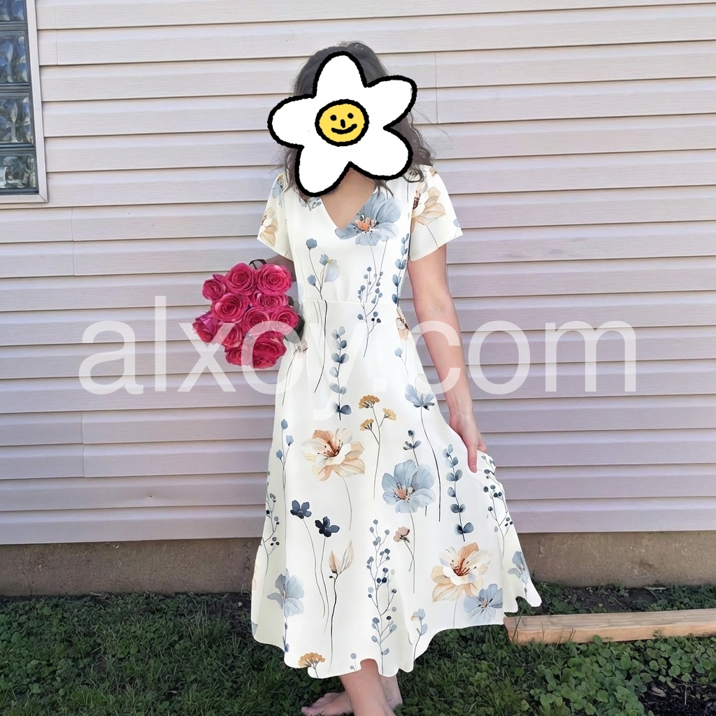 This midi dress features fresh watercolor florals and a side slit for a graceful flow. The V-neck and short sleeve design is lightweight and summer-friendly.