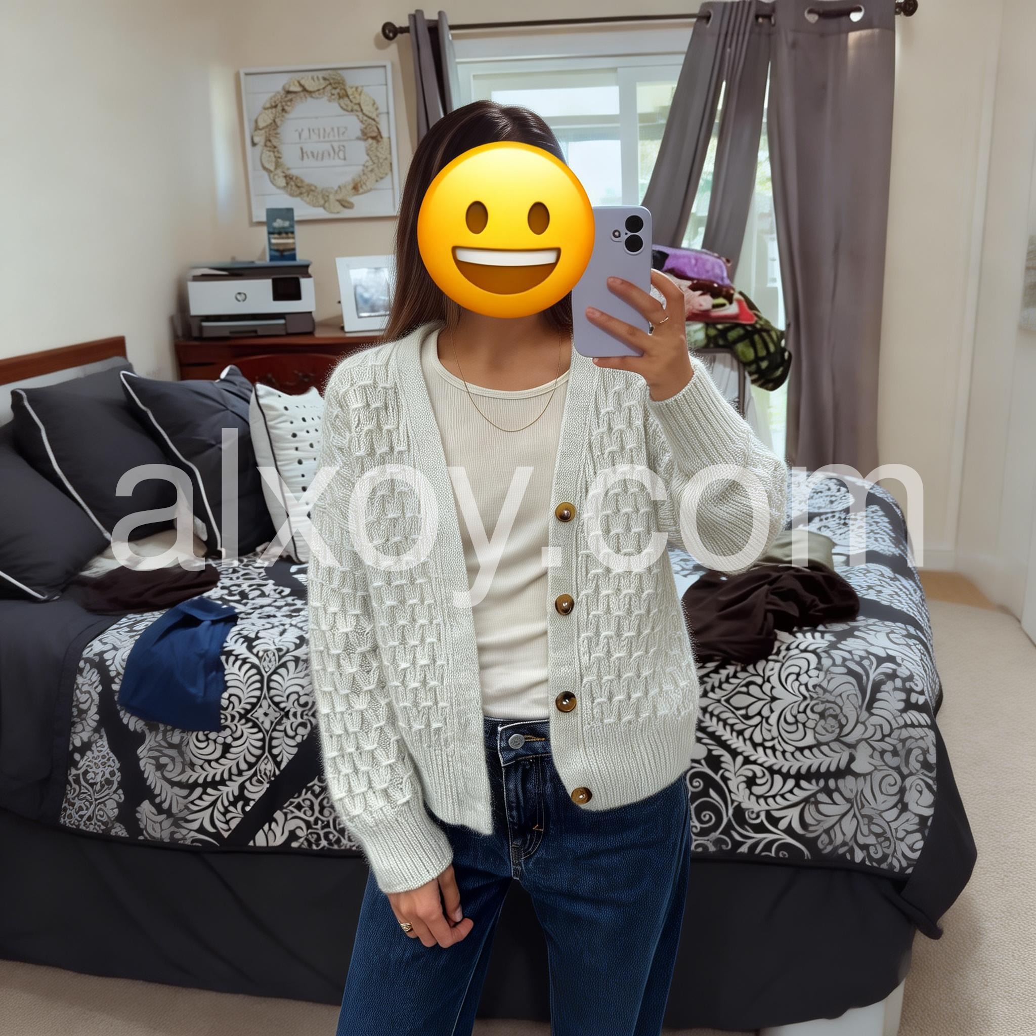 I am obsessed with the buttons on this cardigan! They contrast beautifully with the light yarn. I find myself reaching for this piece almost every morning. Great everyday sweater.