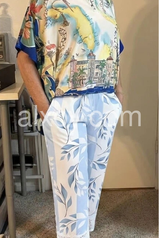 These flowy wide-leg pants feature a soft blue and white leaf pattern with a delicate lace hem. Elastic waistband and side pockets for comfort. Lightweight fabric perfect for warm days. Ideal for beachwear or casual summer styles. Elegant and breezy design.