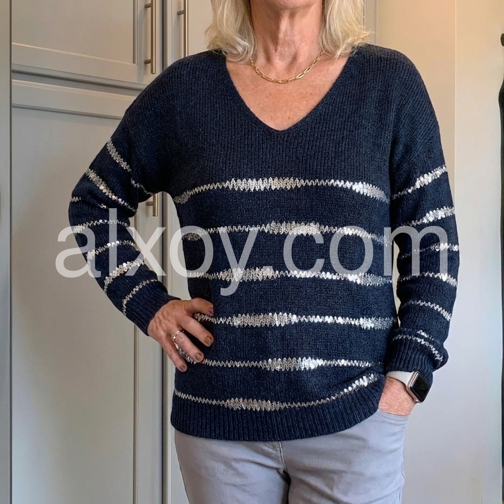 Stay stylish and warm with our Groovy V-Neck Striped Print Navy Sweater. The v-neck adds a touch of elegance while the striped print adds a trendy flair. Made with high-quality materials, this sweater is perfect for any occasion. Upgrade your wardrobe and stay cozy this season.