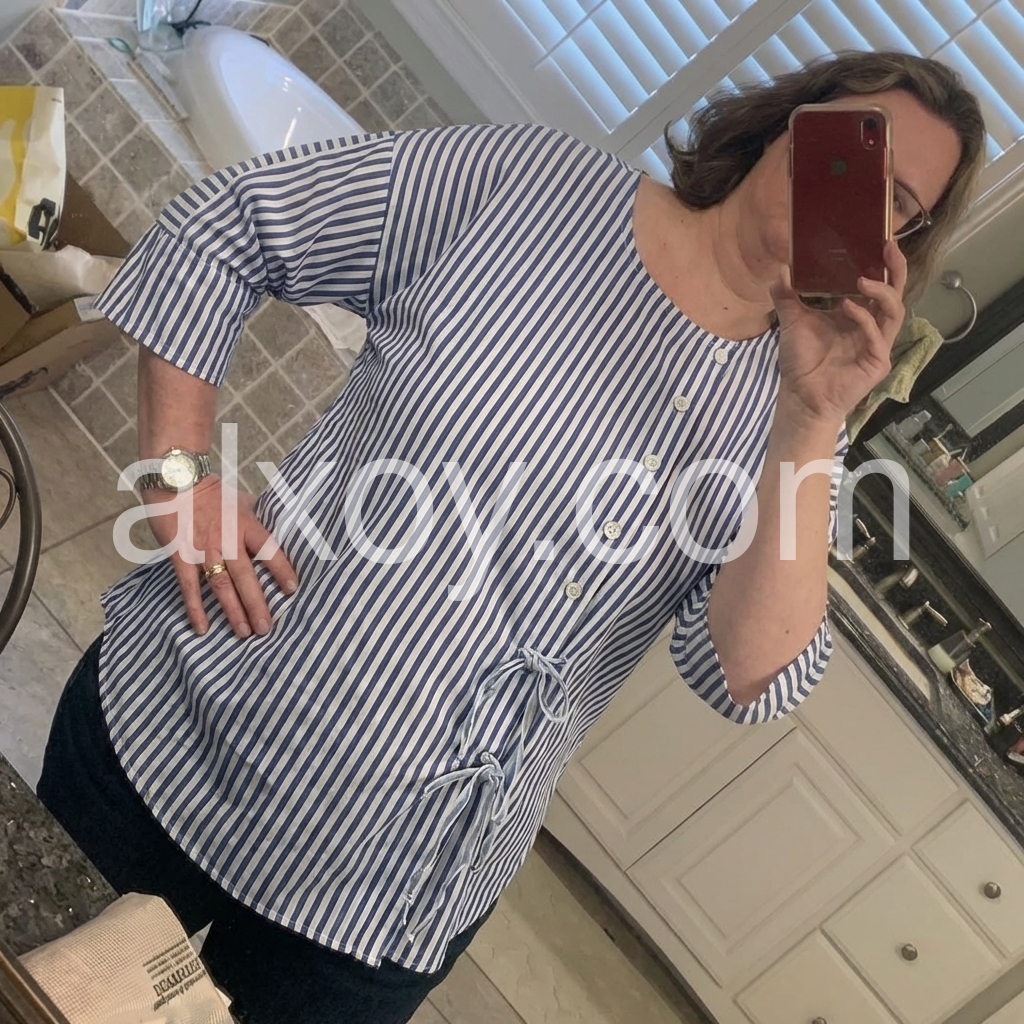 This loose-fit top features vertical blue and white stripes with a clean, casual look. Round neckline and front button-down design for easy wear. Side ties add a feminine touch. Three-quarter sleeves with rolled cuffs. Perfect for everyday comfort and effortless style.