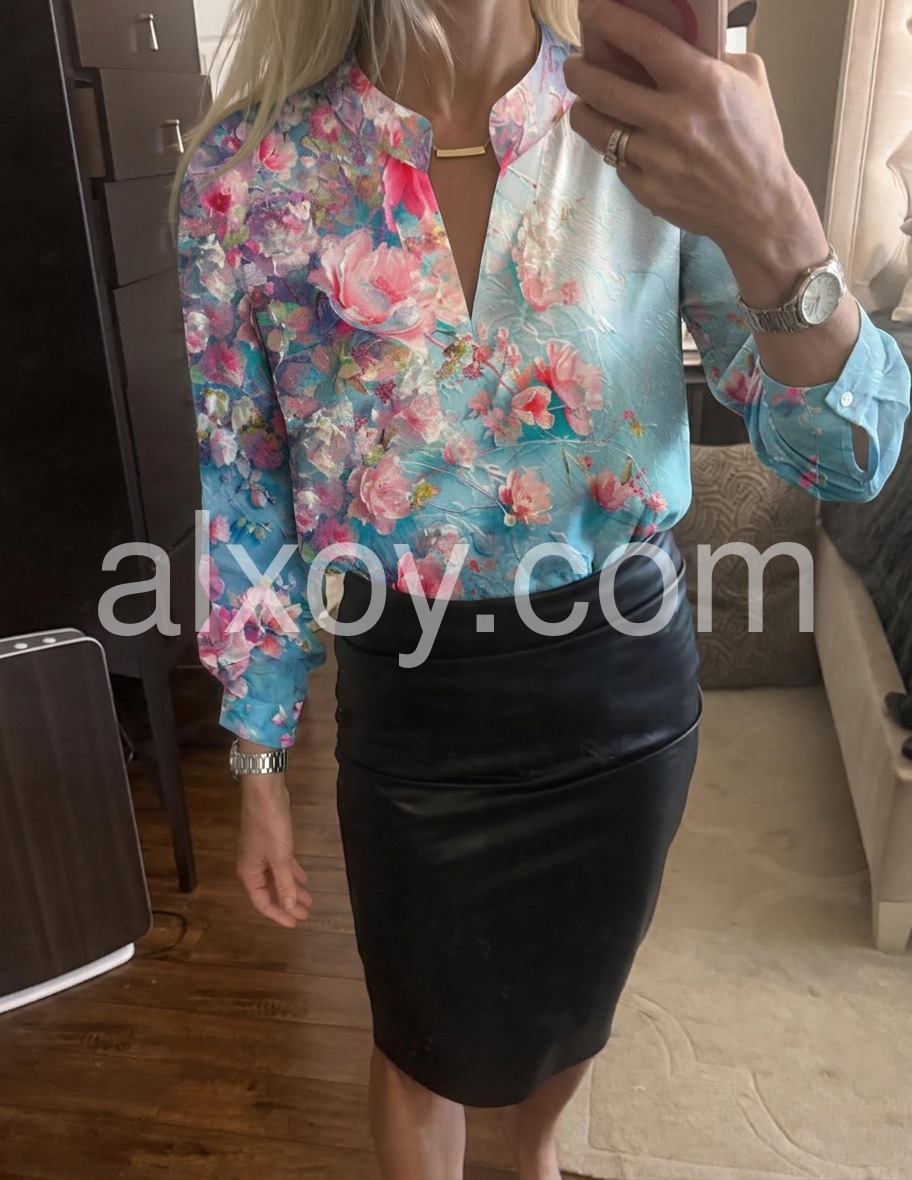 Style# 1544516Bring a burst of elegance to your wardrobe with this Fresh Turquoise Floral Print Top, a stunning piece that blends vibrant floral artistry with luxurious fabric. Crafted from a smooth, satin-like material—likely silk or satin blend—this blouse features a rich turquoise base adorned with a lush watercolor-inspired floral pattern in soft pinks, coral, white, and hints of green. The bold yet romantic design creates a dreamy, garden-fresh look perfect for warm weather. A subtle V-neckline adds a touch of sophistication, while the long sleeves with buttoned cuffs offer versatility and a polished finish. The relaxed, slightly flowy silhouette drapes beautifully over the body, making it ideal for pairing with jeans, tailored pants, or high-waisted skirts. Styled here with denim and layered jewelry, it effortlessly balances casual comfort with refined style. Whether you're heading to a daytime event, brunch, or a summer outing, this floral blouse brings grace, color, and timeless charm to every look.