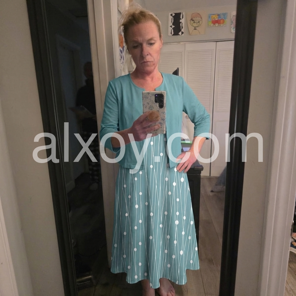 This flowing midi dress with white polka dots on a turquoise background. Paired with a matching short sleeve jacket for a polished look. Comfortable and stylish for casual outings or garden events. Lightweight fabric perfect for warm days. Effortlessly chic and feminine.