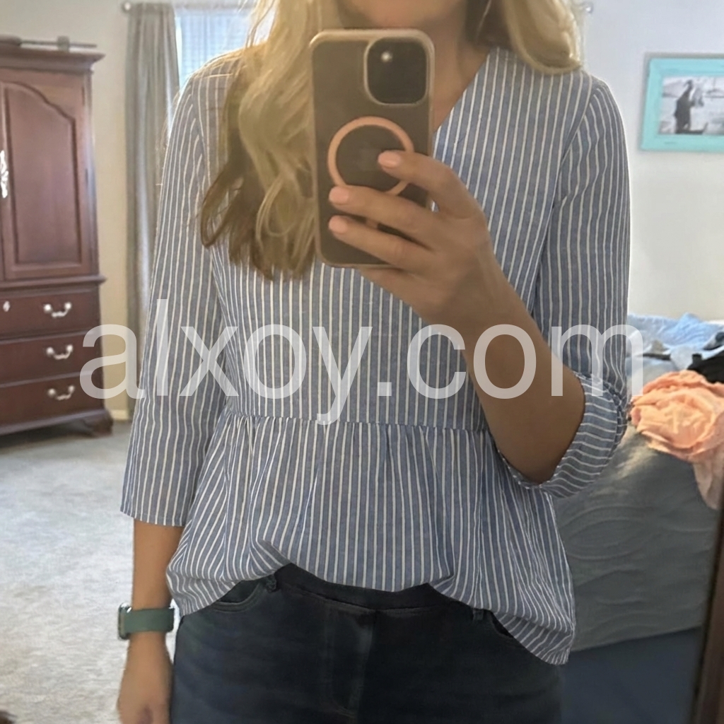 This relaxed-fit tunic features vertical blue and white stripes with a soft V-neckline. Three-quarter sleeves with rolled cuffs for a casual look. Gathered waist creates a flattering silhouette. Lightweight fabric perfect for everyday wear. Ideal for pairing with jeans or leggings.