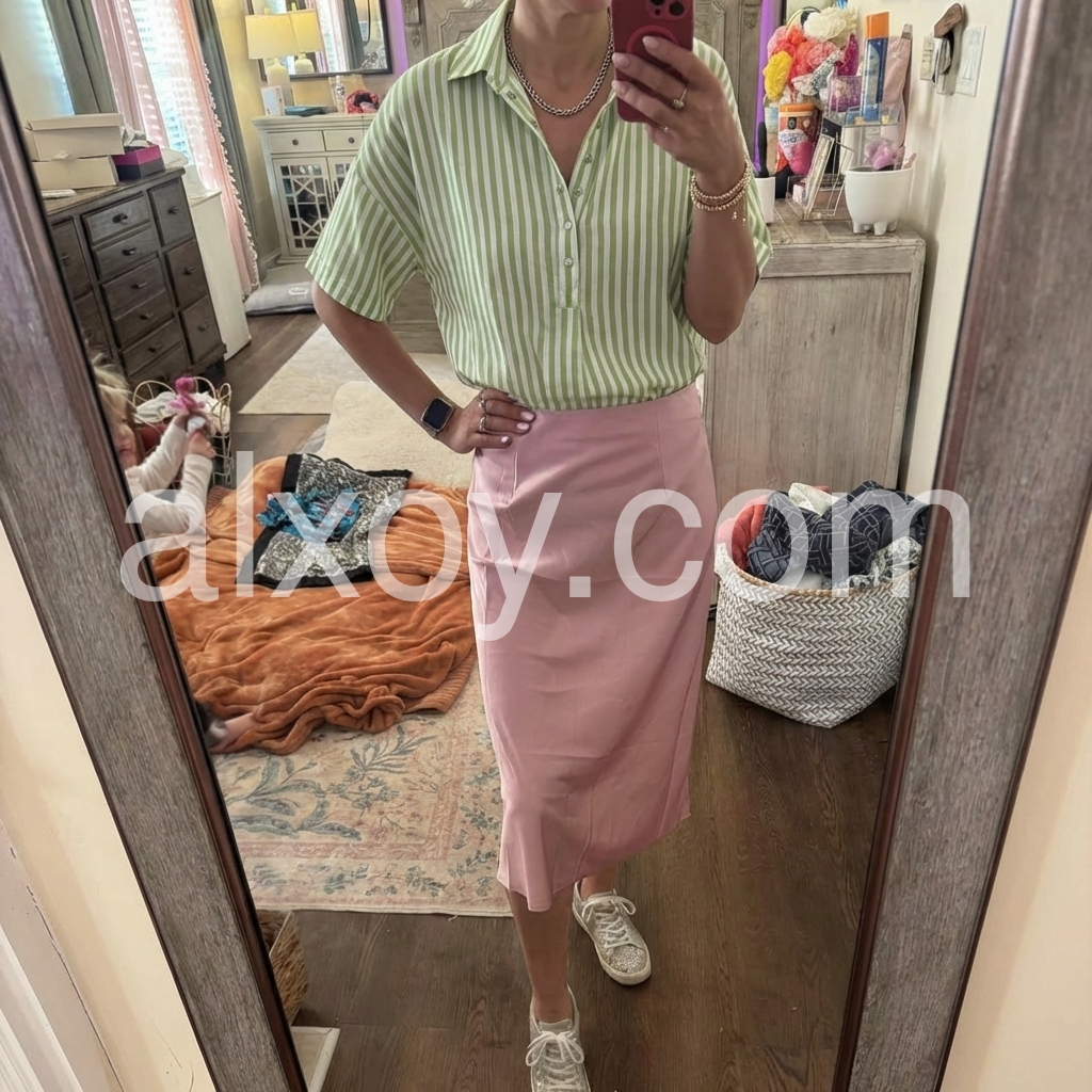This blouse reimagines classic stripes with a modern, relaxed silhouette. The fresh green-and-white vertical print evokes timeless, preppy style.