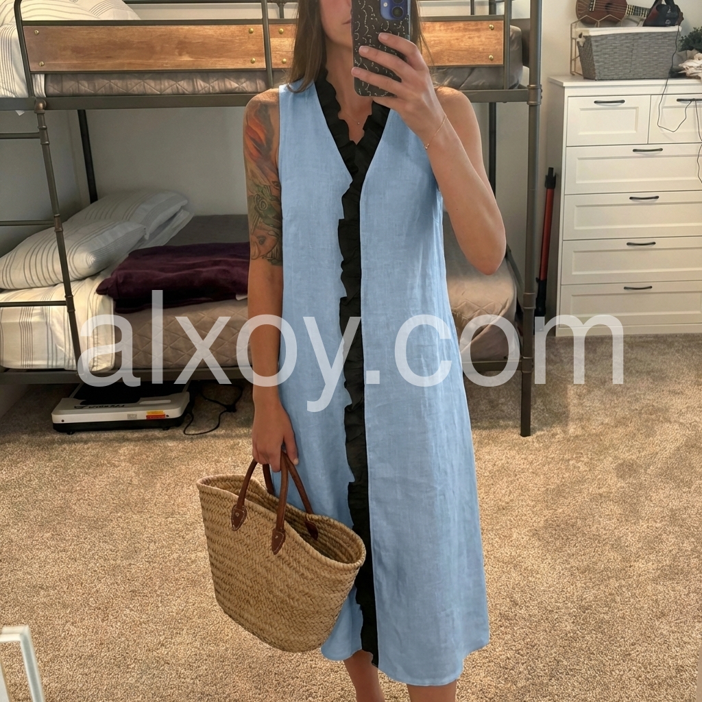 Sky Blue Black Ruffle Sleeveless Midi Dress