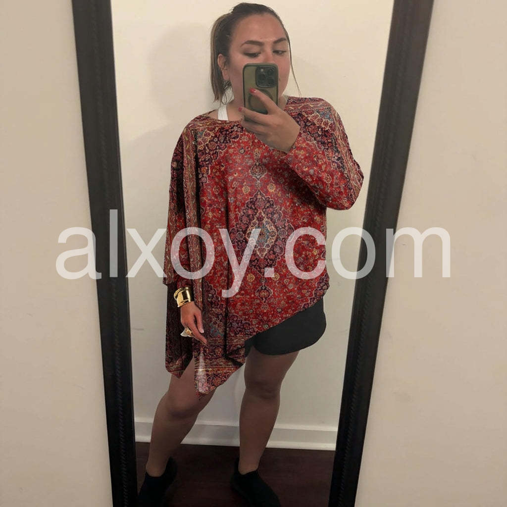 If you are looking for a top that is forgiving and stylish, this is it. The asymmetrical cut creates a lovely silhouette that elongates the body. The vintage rug pattern is gorgeous in person. Very happy with my purchase.