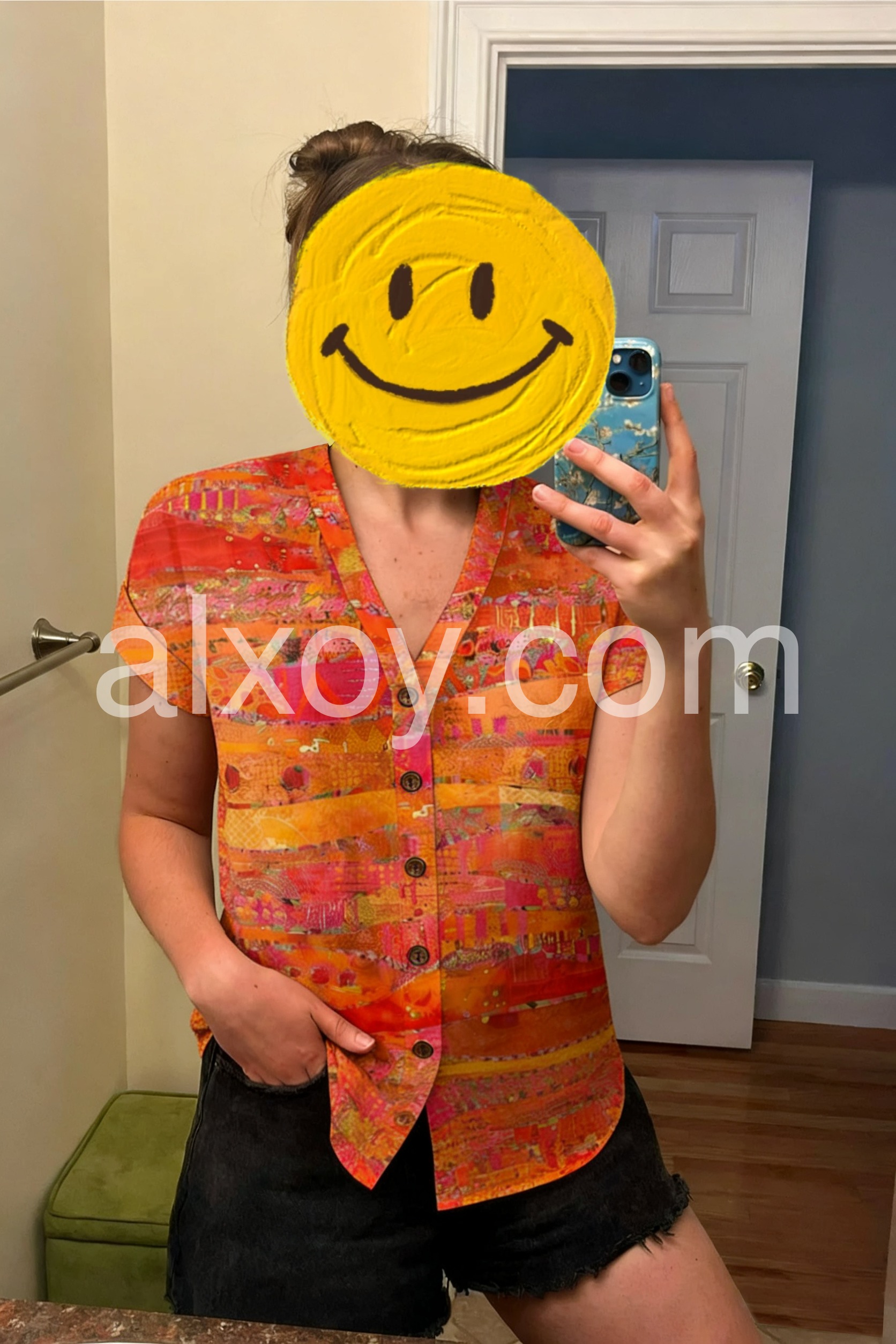 This short-sleeve button-up blouse features a lively orange and pink abstract pattern. The V-neck design adds a touch of elegance. Lightweight fabric for comfort and breathability. Perfect for making a statement in casual or boho outfits. Pair with jeans or trousers for effortless style.