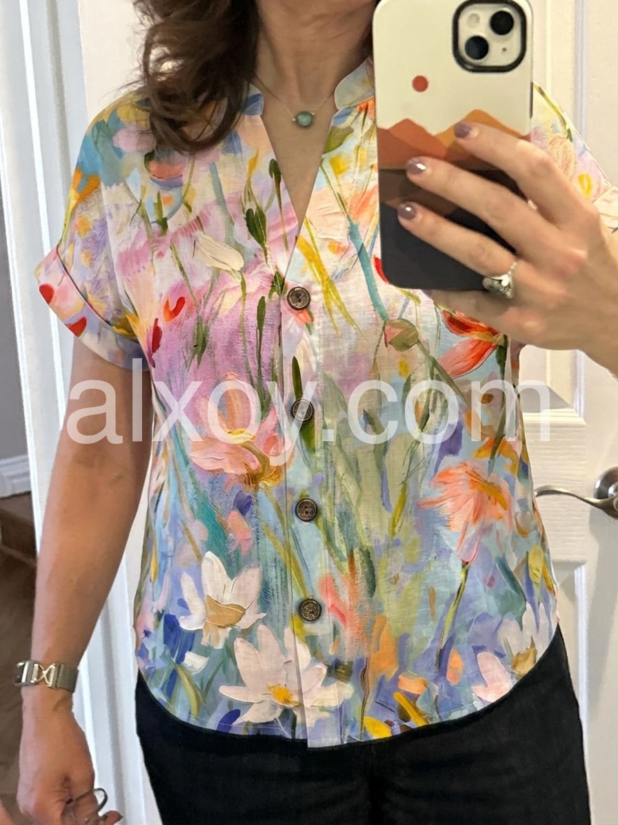 Elevate your seasonal wardrobe with this Chic Watercolor Floral Print Short Sleeve Top, a dreamy and artistic top that captures the essence of blooming spring. Crafted from lightweight, breathable fabric—likely cotton or rayon blend—this short-sleeve blouse features a delicate watercolor-inspired print in soft pastel hues of blush pink, lavender, peach, and sky blue, accented with hints of green and gold. The floral design flows across the fabric like a painted garden, creating a romantic and effortless look. A classic V-neckline and front button closure add structure and versatility, while the relaxed fit ensures comfort and ease. Perfectly paired with jeans, high-waisted shorts, or flowy pants, it’s ideal for casual outings, weekend brunches, or warm-weather strolls. Styled here with layered necklaces and a sleek watch, it blends boho charm with modern simplicity. Let this floral blouse bring a touch of gentle elegance and vibrant color to your everyday style.