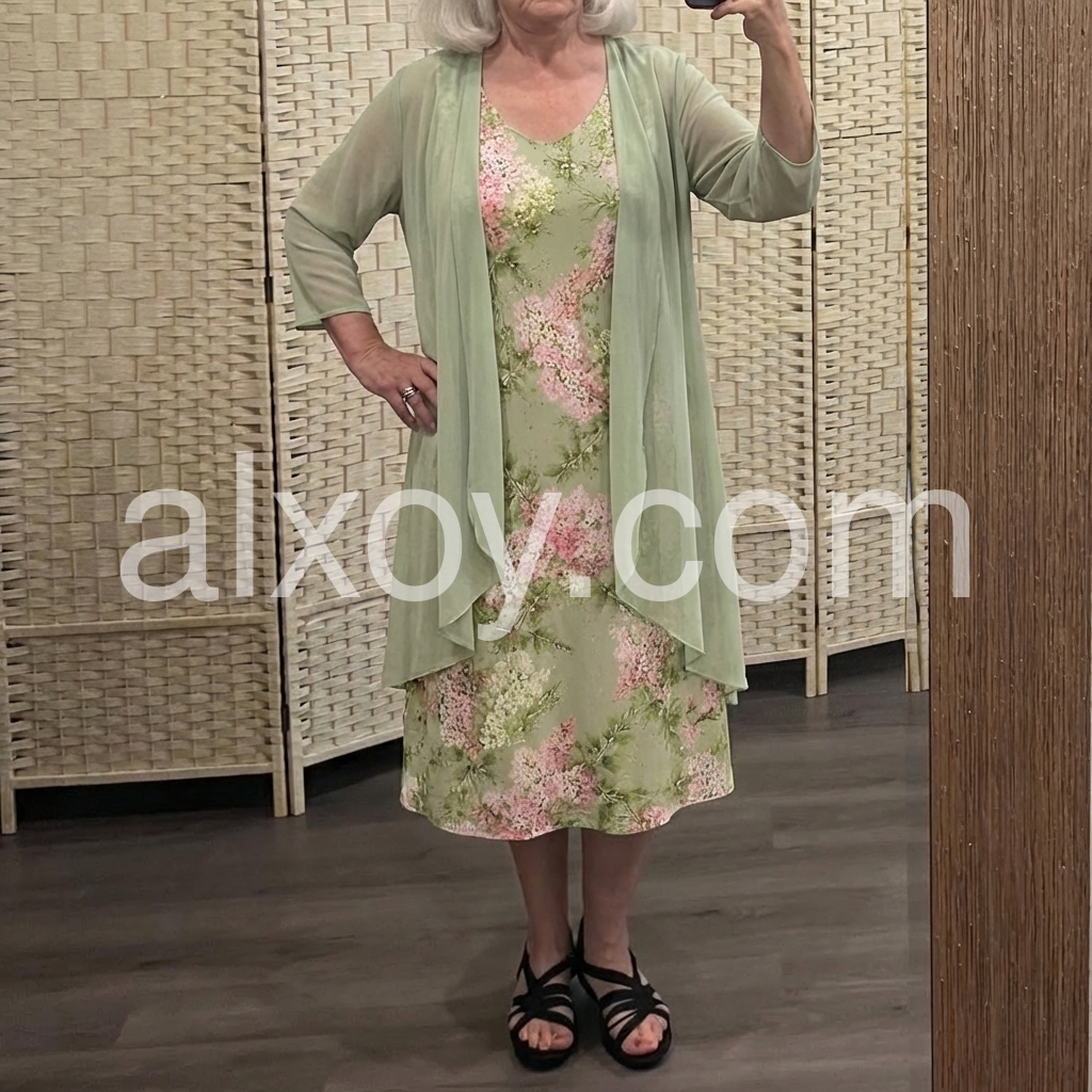 This soft floral dress features a light green base with pink and white blossoms. Paired with a matching sheer duster for a layered look. V-neckline and relaxed fit perfect for warm days. Ideal for garden parties or casual outings. Fresh and feminine style.