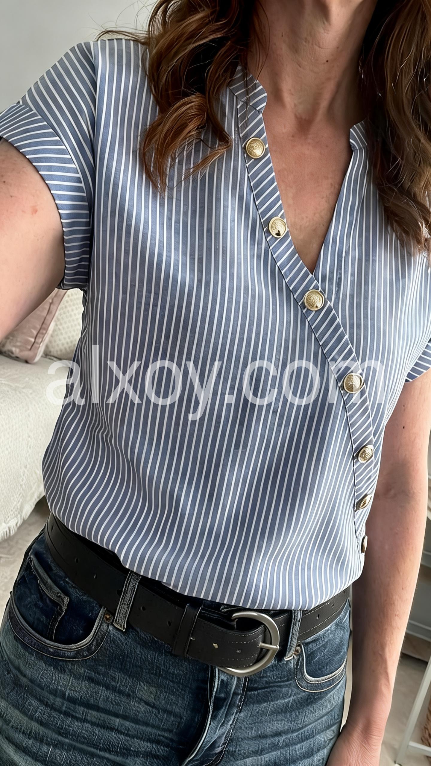 This fitted top features vertical blue and white stripes with a stylish diagonal button closure. Short flutter sleeves and a V-neckline for a feminine touch. Lightweight fabric perfect for warm weather. Ideal for casual outings or everyday wear. Effortlessly chic and comfortable.